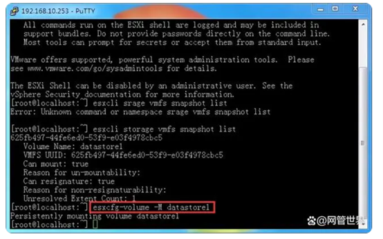 5. 可以用esxcfg-volume -M VMFS_UUID|label命令掛載即可,我的掛載命令是:esxcfg-volume -M datastore1