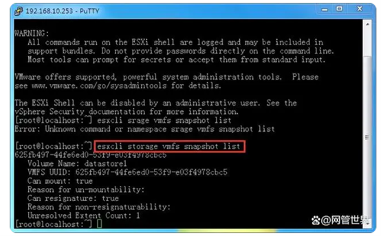 4. 查看沒有掛載的數據存儲信息,用命令:esxcli storage vmfs snapshot list