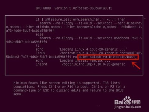 找到帶 recovery nomodeset這句,把它連帶它后面的語句(如果有的話)全部刪除,在同樣位置輸入 quiet splash rw init=/bin/bash