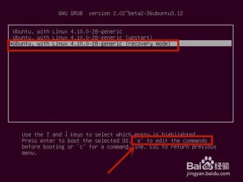 用鍵盤上下鍵移動光標到recovery mode,按e鍵