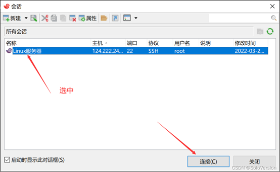 5、此時我們回到Xshell主界面,從菜單欄找到“文件”并在下拉菜單中點擊“打開”,此時會出現會話對話框,在這里有很多設置好的連接服務器任務,我們選擇需要連接的服務器,在左邊方框中點選,然后單擊“連接”就能連上服務器了。